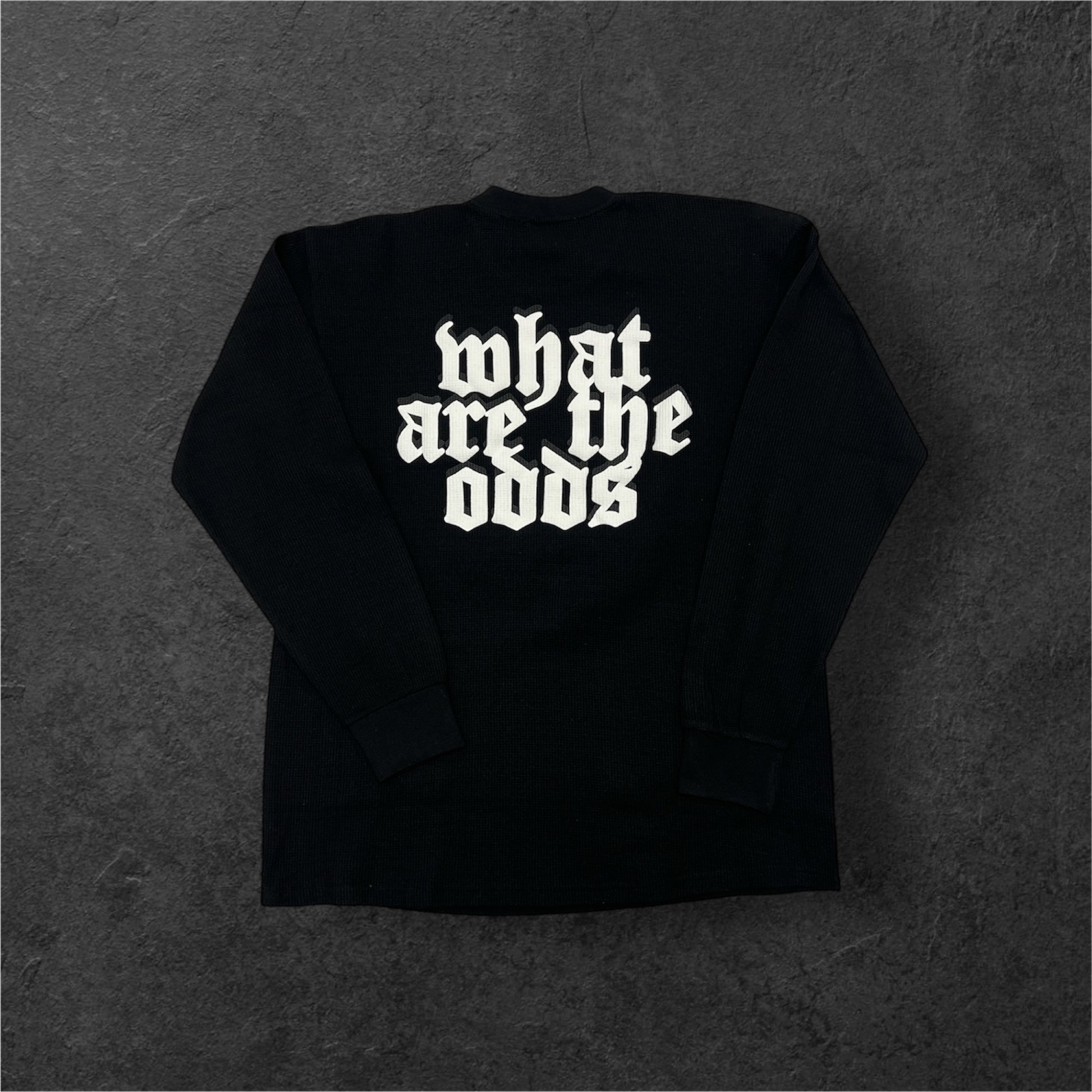 Featuring reflective ink graphics on the upper-left chest and a jumbo reflective ink “Whataretheodds” print on the back.