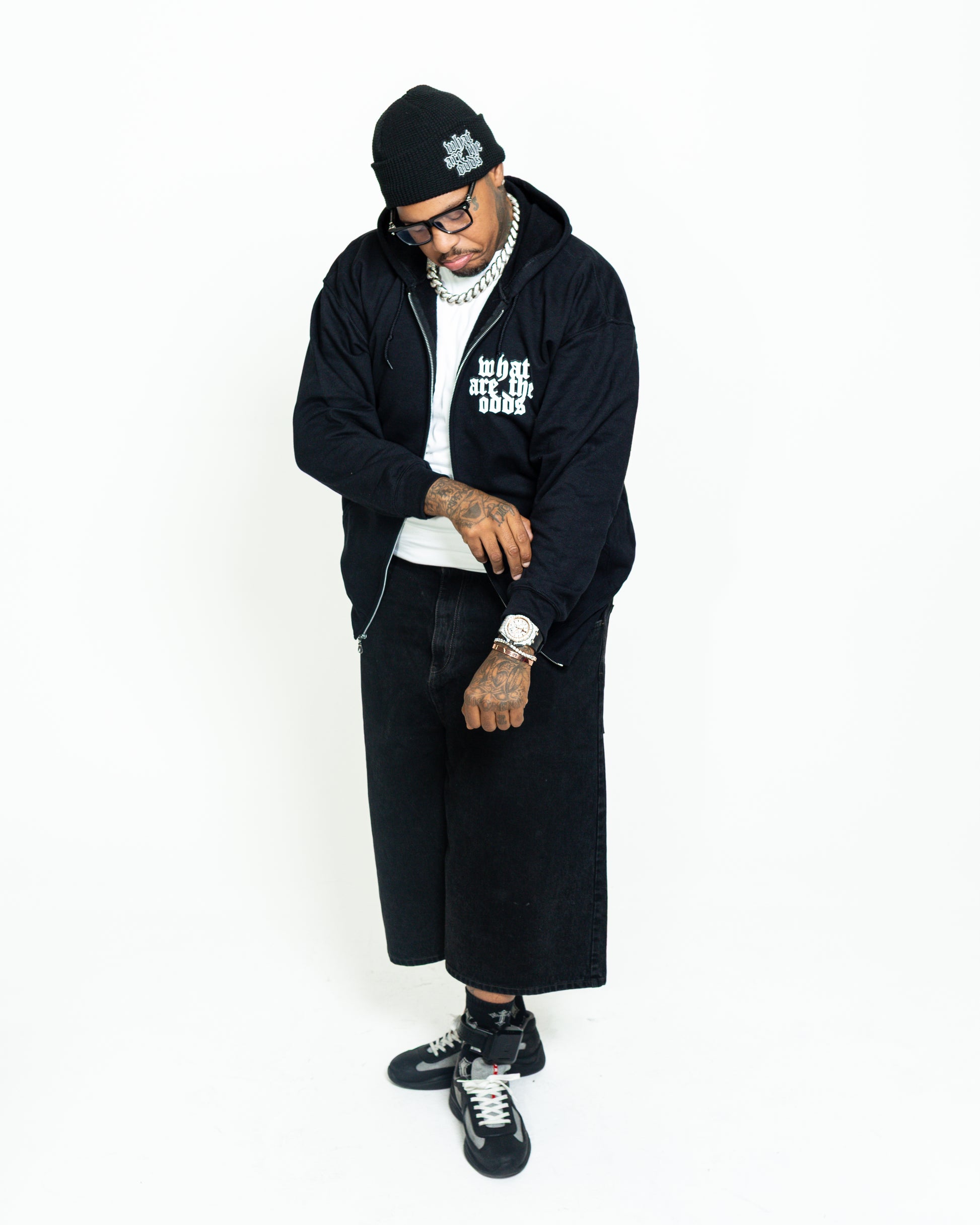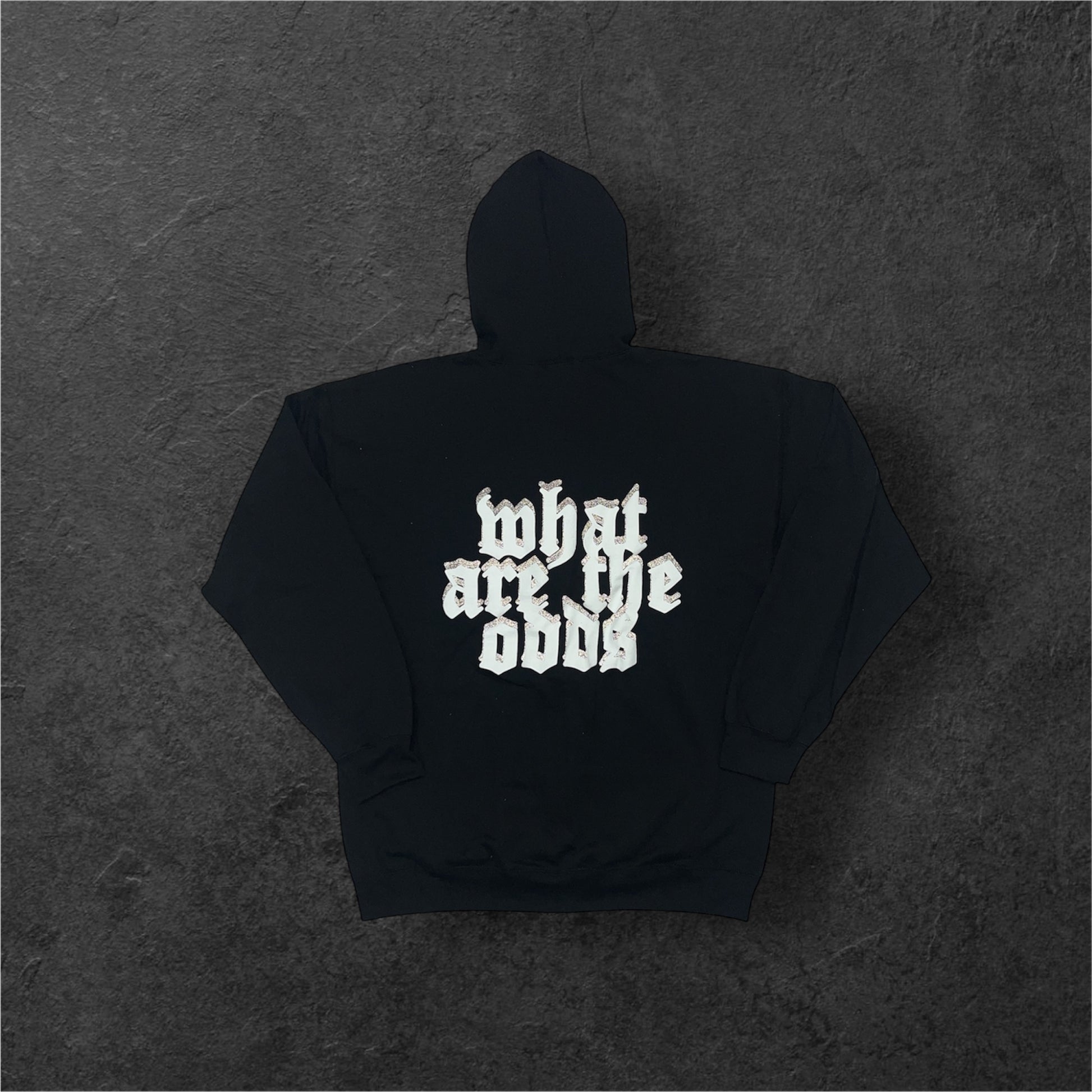 Featuring reflective ink graphics on the upper-left chest and a jumbo reflective ink “Whataretheodds” print on the back.